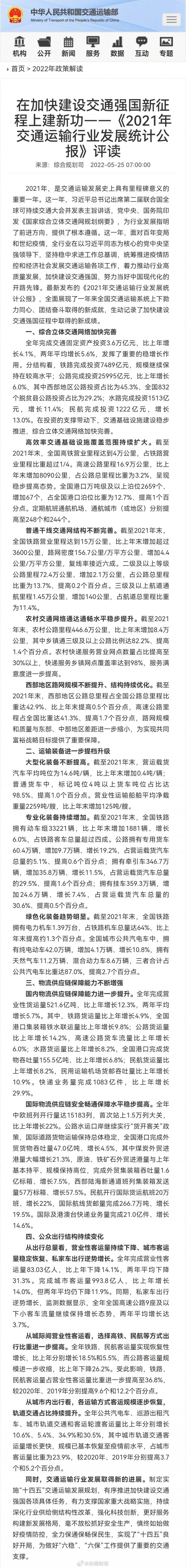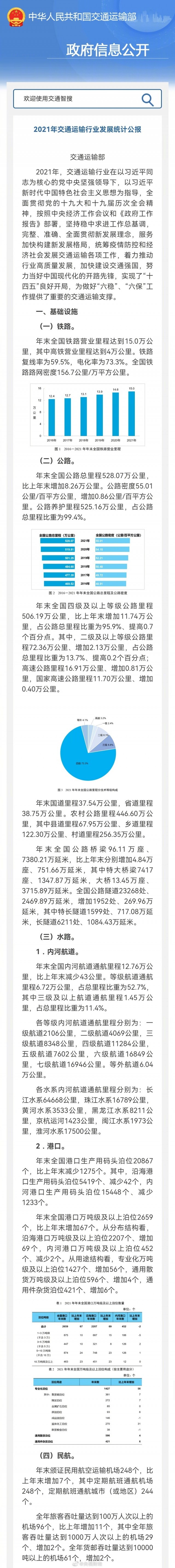 今天(25日),交通運(yùn)輸部發(fā)布《2021年交通運(yùn)輸行業(yè)發(fā)展統(tǒng)計(jì)公報(bào)》。2021年我國完成交通固定資產(chǎn)投資3.6萬億元,比2020年增長4.1%,分結(jié)構(gòu)看,鐵路完成投資7489億元,規(guī)模繼續(xù)保持在較高水平。截至2021年末,我國高鐵營業(yè)里程達(dá)到4萬公里,占鐵路營業(yè)里程比重超過1/4。此外,我國農(nóng)村交通網(wǎng)絡(luò)通達(dá)通暢水平穩(wěn)步提升。去年,我國農(nóng)村公路里程446.6萬公里,比2020年增加8.4萬公里。農(nóng)村快遞服務(wù)營業(yè)網(wǎng)點(diǎn)數(shù)量占比提高至30%以上,快遞服務(wù)鄉(xiāng)鎮(zhèn)網(wǎng)點(diǎn)覆蓋率達(dá)到98%,服務(wù)滿意度進(jìn)一步提高。