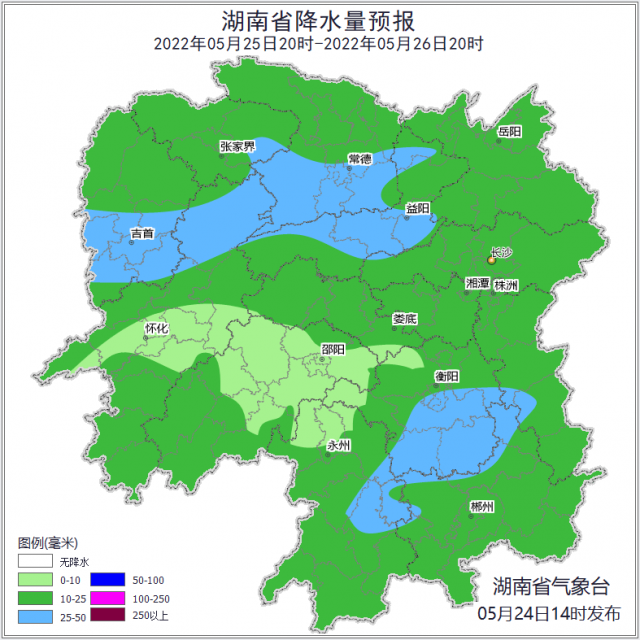 25日至27日,降雨范圍擴(kuò)大,強(qiáng)度減弱,全省大部有小到中雨,湘北、湘南局地有大雨。