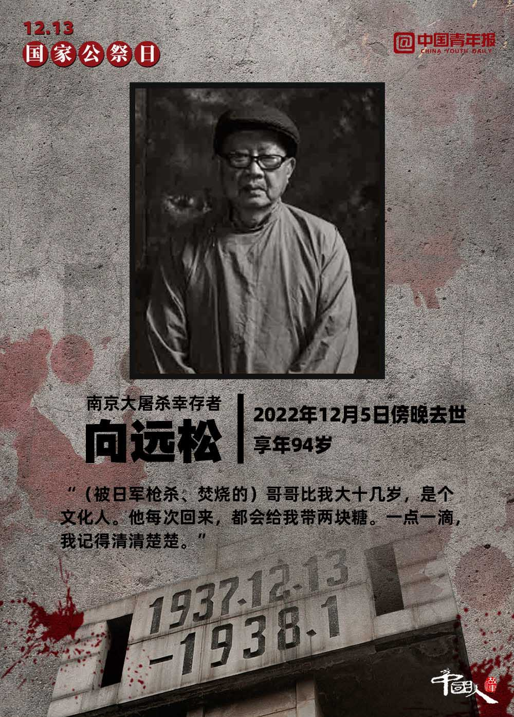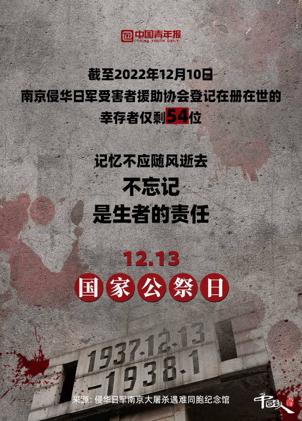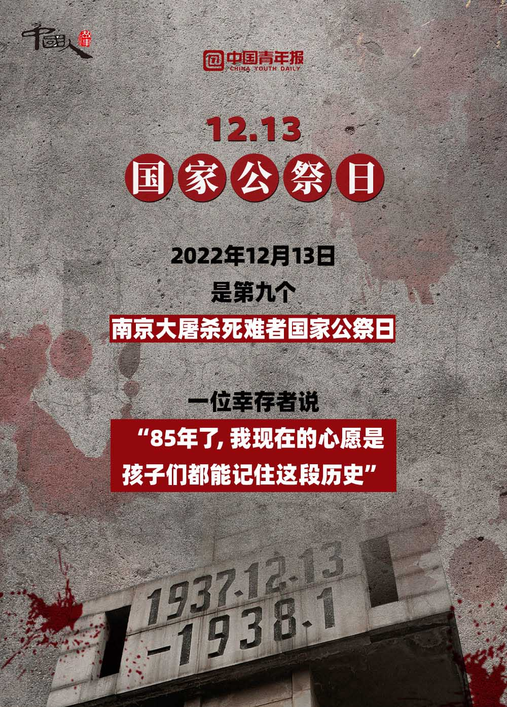 12月13日,是第九個南京大屠殺死難者國家公祭日 。截至2022年12月12日,南京侵華日軍受害者援助協(xié)會登記在冊在世的幸存者僅剩54位。一位南京大屠殺幸存者說:“85年了,我現(xiàn)在的心愿是孩子們都能記住這段歷史?!弊屛覀儗⑦@段歷史銘刻在內(nèi)心深處,讓“記住”化作一種責(zé)任,伴著我們堅(jiān)定前行。