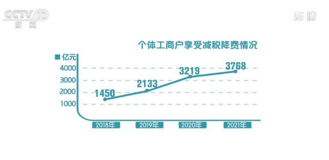 據(jù)了解,2018年以來,我國(guó)已經(jīng)累計(jì)為個(gè)體工商戶減稅降費(fèi)13855億元,其中,減稅13567億元,降費(fèi)288億元。分年度來看,2018年到2021年,個(gè)體工商戶享受減稅降費(fèi)分別為1450億元、2133億元、3219億元和3768億元,規(guī)模逐年擴(kuò)大。