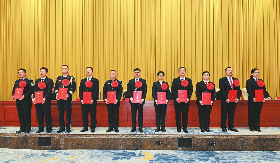 1月24日,平安山西建設表彰大會上,受到表彰的“平安山西建設先進個人”代表上臺領獎。 記者李聯(lián)軍攝