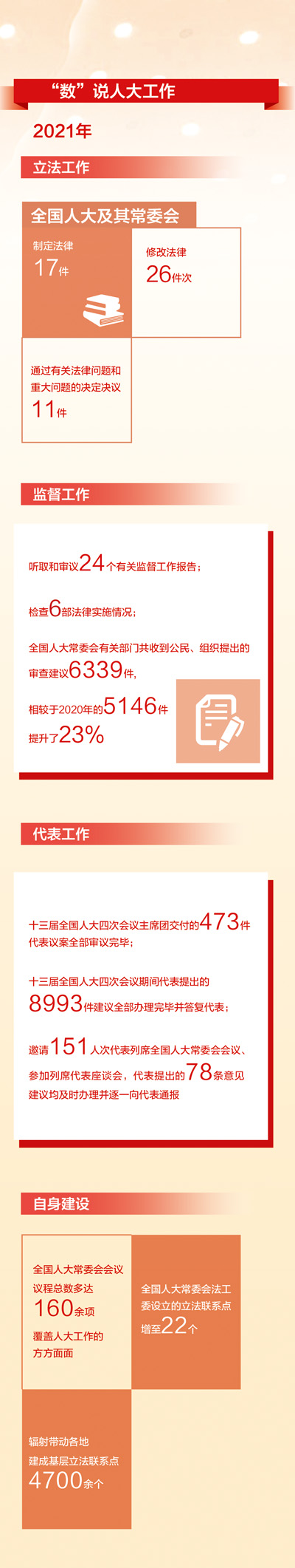 過去一年,十三屆全國人大及其常委會(huì)深入學(xué)習(xí)貫徹習(xí)近平總書記關(guān)于堅(jiān)持和完善人民代表大會(huì)制度的重要思想,全面貫徹落實(shí)中央人大工作會(huì)議精神,緊緊圍繞黨和國家工作大局依法履職盡責(zé),勇于擔(dān)當(dāng)、善于作為,立法節(jié)奏蹄疾步穩(wěn),依法監(jiān)督提質(zhì)增效,代表工作不斷完善,自身建設(shè)持續(xù)加強(qiáng),人民代表大會(huì)制度不斷展現(xiàn)新的生機(jī)和活力。