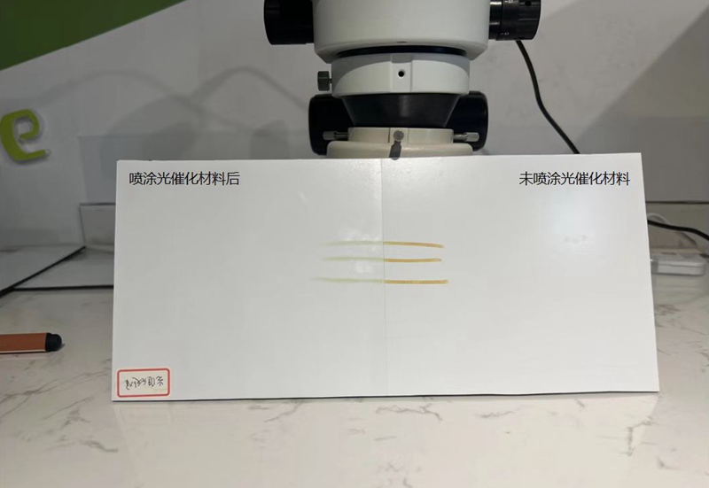 “將一塊鋁面板一分為二,一塊噴涂光催化涂膜,另一塊不噴涂。用有機(jī)染料筆模仿外界污染物,在兩塊材料表面標(biāo)記后,通過一分鐘紫外光燈照射,可看出噴涂了光催化涂膜的瓷磚鋁板部分染料降解效果明顯更高?!惫ぷ魅藛T告訴人民網(wǎng)浙江頻道,根據(jù)國(guó)家權(quán)威檢測(cè)機(jī)構(gòu)的實(shí)驗(yàn)證明,每噴涂1立方米的光催化涂膜,就能清除95%的甲醛。