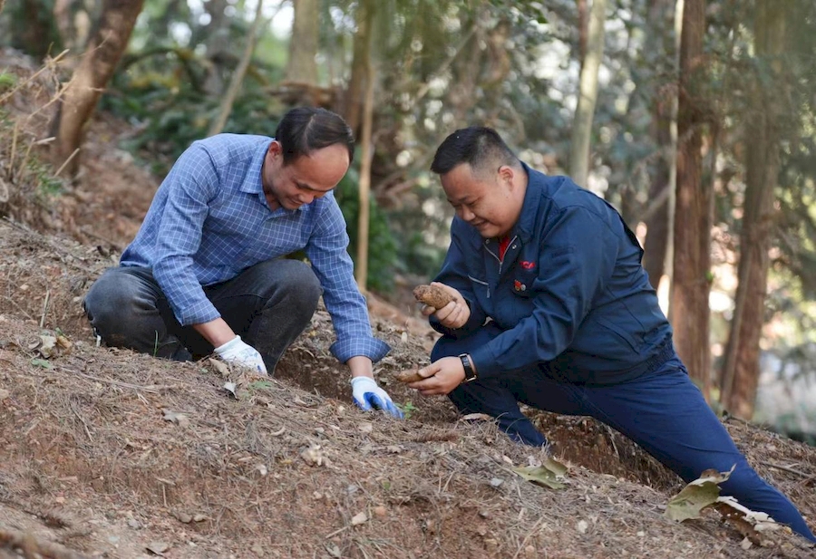 俞???右一)正在指導(dǎo)農(nóng)戶種植天麻。龔旭東供圖