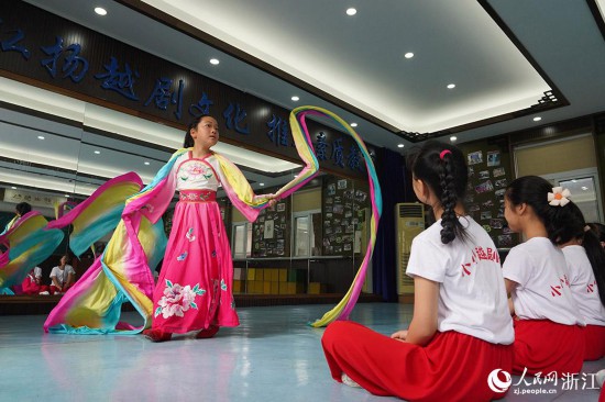 浙江省嵊州市城南小學排練房里,學生正在排練越劇。人民網 章勇濤攝