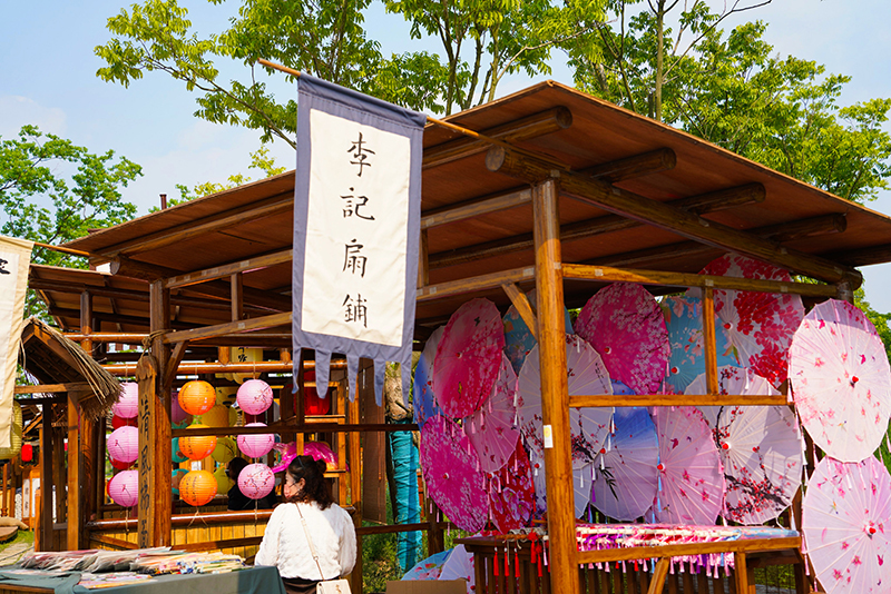 看罷演出,沿湖邊向東而行,是新近完善的“宋朝集市”?!盎㈩^鞋”“界首彩陶”“油紙傘”“古法燒制酒”等應有盡有,“小販們”則身著古裝,起勁吆喝,兜攬生意,再現當年宋朝集市的盛況。