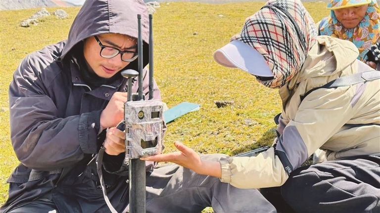 保護中心工作人員李義旺教當地農牧民架設紅外相機。