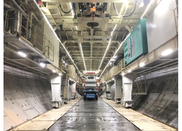 珠海興業(yè)快線隧道工程現(xiàn)場(chǎng),一臺(tái)重4500噸、超5層樓高的“地下航母”正奮勇掘進(jìn),管片一片一片拼裝,隧道隨之一米一米建成。這臺(tái)“地下航母”,就是由中交天和自主研制的中國(guó)首臺(tái)超大直徑同步掘進(jìn)機(jī)“興業(yè)號(hào)”,這也是國(guó)內(nèi)首次采用的同步掘進(jìn)設(shè)計(jì)。常規(guī)隧道掘進(jìn)機(jī)拼裝管片,一環(huán)管片寬2米,刀頭油缸推動(dòng),而油缸推動(dòng)距離僅為2米多。因而,掘進(jìn)2米后必須停止,掘進(jìn)一環(huán)耗時(shí)近60分鐘,拼裝管片一環(huán)耗時(shí)近45分鐘?!芭d業(yè)號(hào)”的關(guān)鍵在于同步掘進(jìn),它改變了傳統(tǒng)油缸設(shè)計(jì),推動(dòng)距離可延長(zhǎng)至4米,刀頭可實(shí)現(xiàn)持續(xù)掘進(jìn),后方同時(shí)拼裝管片,施工速度較國(guó)內(nèi)外同類(lèi)掘進(jìn)機(jī)提升25-35%,對(duì)超大直徑盾構(gòu)機(jī)發(fā)展具有一定劃時(shí)代意義。