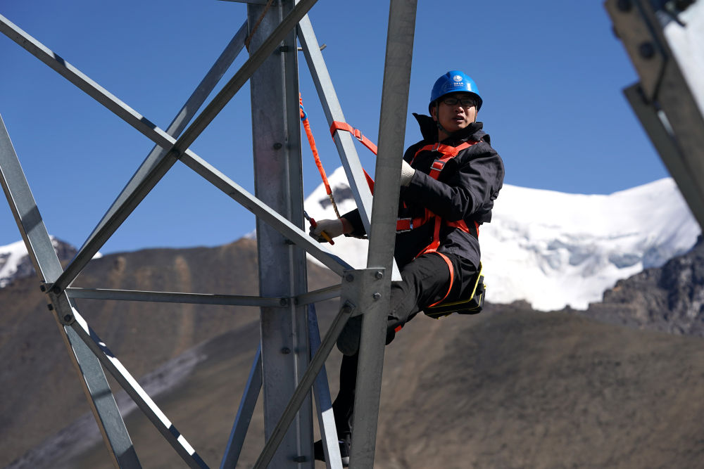 在西藏山南市洛扎縣,國家電網(wǎng)安徽省電力有限公司援藏工作人員徐四勤在浪洛線197號鐵塔進(jìn)行線路巡視(2020年11月4日攝)。新華社記者 詹彥 攝