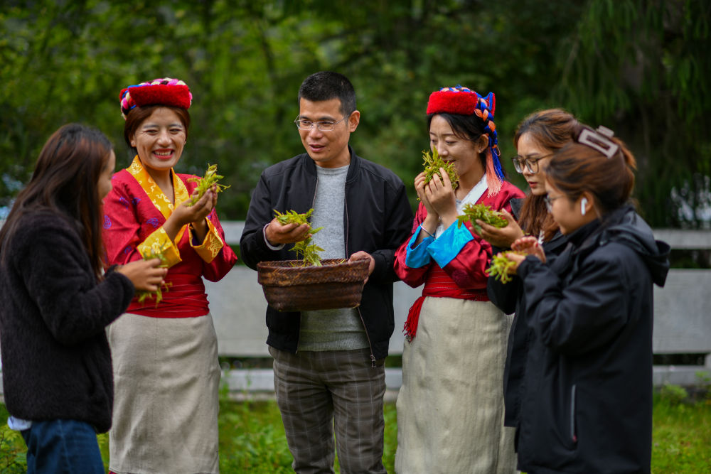 安徽省援藏干部王天柱(左三)為西藏錯那市的貢日門巴民族鄉(xiāng)斯木村干部群眾講解莓茶采摘技術(shù)要求(2023年7月28日攝)。 新華社記者 姜帆 攝