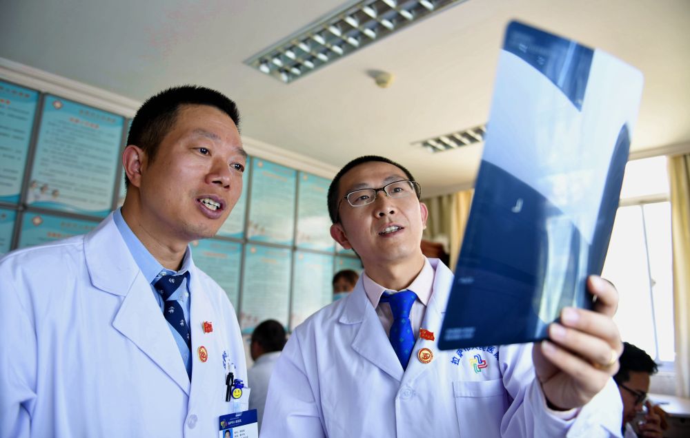 在拉薩市人民醫(yī)院骨科病房,北京積水潭醫(yī)院的援藏醫(yī)生龔曉峰(右)和北京天壇醫(yī)院援藏醫(yī)生李家謀查看患者的X光片(2017年8月3日攝)。 新華社記者 晉美多吉 攝