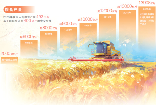 豐收成色十足?!安丶Z于地、藏糧于技”戰(zhàn)略深入實施,我國糧食綜合生產(chǎn)能力穩(wěn)步提升,連續(xù)9年穩(wěn)定在1.3萬億斤以上。截至2023年,全國綠色、有機、名特優(yōu)新和地理標(biāo)志農(nóng)產(chǎn)品認(rèn)證登記總數(shù)達(dá)到7.5萬個。蔬菜水果品種琳瑯滿目,居民的“菜籃子”“果盤子”更加豐富。
