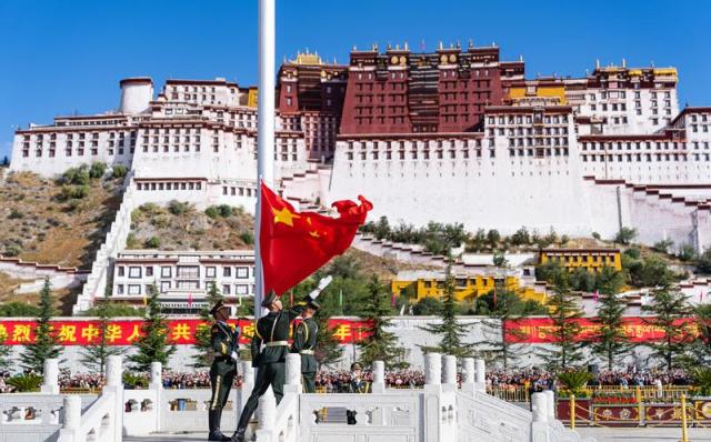 10月1日,拉薩市布達(dá)拉宮廣場(chǎng)舉行升國旗儀式。 新華社記者 丁增尼達(dá) 攝