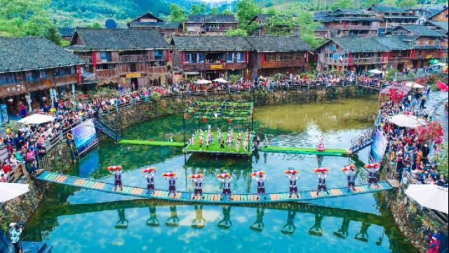 廣西投入中央財(cái)政少數(shù)民族發(fā)展資金1.6億元,打造民族村寨與鄉(xiāng)村旅游融合發(fā)展試點(diǎn)39個(gè)。圖為2024年4月廣西傳統(tǒng)民族節(jié)日“三月三”期間,來自全國的游客與夢(mèng)嗚苗寨村民一起慶祝節(jié)日。廣西壯族自治區(qū)柳州市民宗委供圖