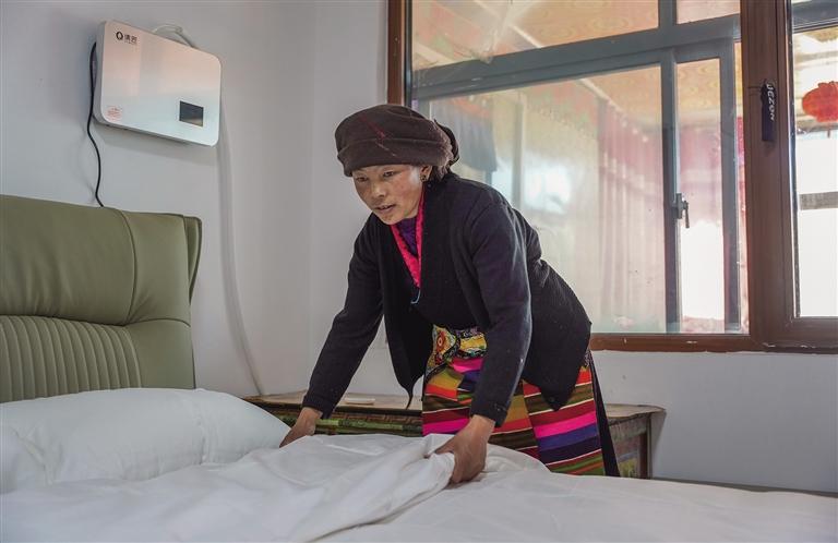 倫珠曲珍今年40歲,是這家的二女兒,15年前嫁到外村,每年都會(huì)回來(lái)看望父母。由于同行的人員出現(xiàn)高反癥狀,倫珠曲珍便主動(dòng)邀請(qǐng)記者到他們家的“高原暖心房”里休息調(diào)整?!案咴姆俊痹O(shè)置在她家客廳的里側(cè),屋內(nèi)寬敞明亮、干凈整潔。墻壁上的恒溫裝置讓屋子始終保持在宜人的20攝氏度左右?!拔覀兇蛟斓摹咴姆俊銣匦Ч貏e好,最高溫度能達(dá)到30多攝氏度。而且因?yàn)槭褂玫牟馁|(zhì)特殊,就算不開(kāi)恒溫裝置,幾個(gè)人待在屋里也不會(huì)覺(jué)得冷。看看這些家具,都是村里愛(ài)心小屋提供的?!绷涡駯|介紹道。