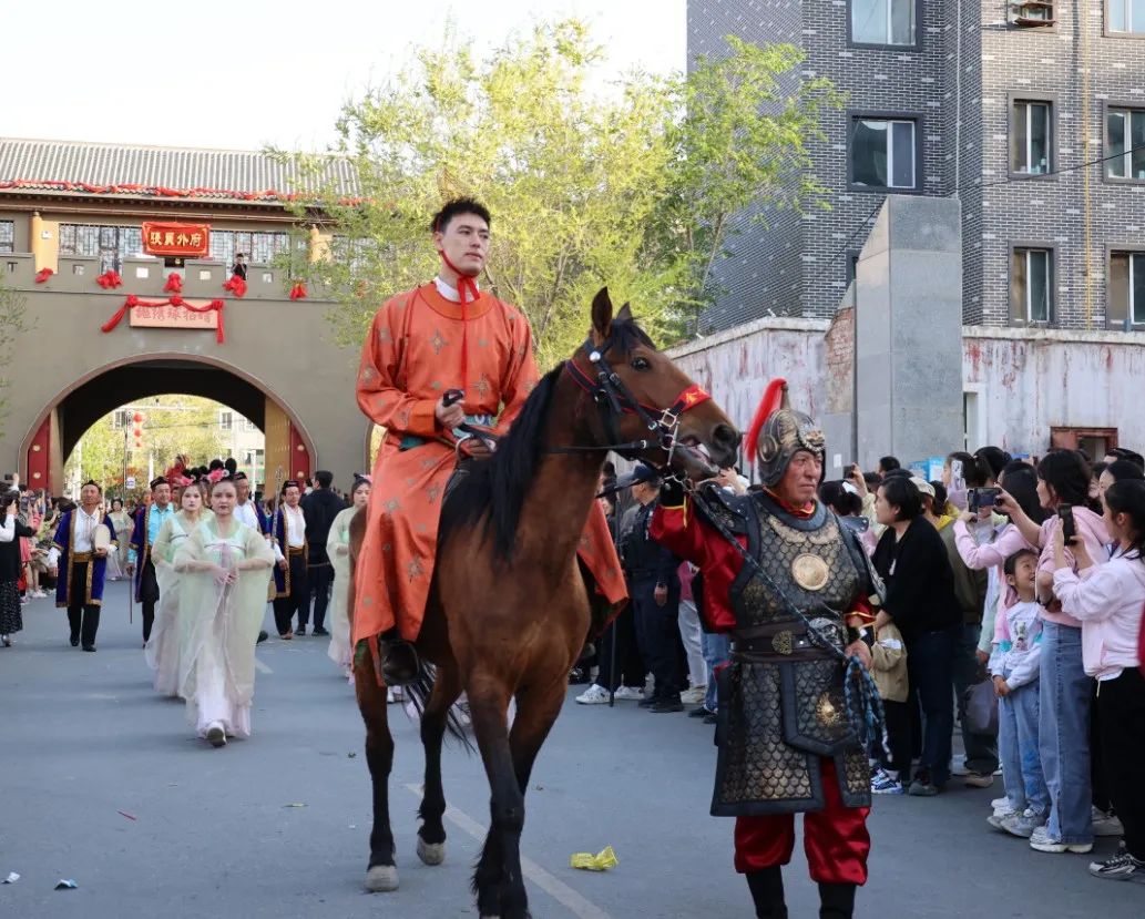 一隊(duì)身著鎧甲、手執(zhí)紅纓槍的威武“瀚海軍”兵士,步伐整齊、沿街巡邏,路上行人紛紛拿出手機(jī)拍照。這是在吉木薩爾縣街頭常見的北庭都護(hù)府將士“巡城護(hù)疆”的精彩場景。