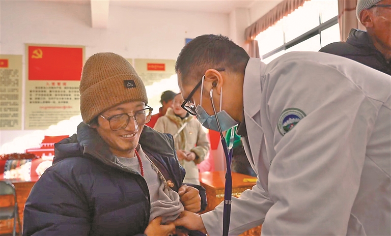 圖為援藏醫(yī)療專家為群眾聽診。 萬靖 攝