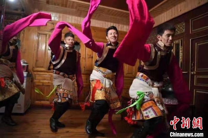 圖為迪慶藏族穿著精美的藏裝在家中載歌載舞。 劉冉陽 攝