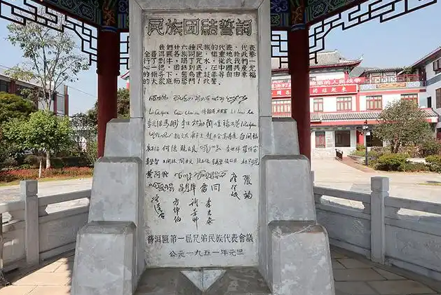 云南省普洱市寧洱哈尼族彝族自治縣民族團(tuán)結(jié)園內(nèi)有一座民族團(tuán)結(jié)誓詞碑,上面刻有“我們一心一德,團(tuán)結(jié)到底”等文字 圖片來源:央視網(wǎng)