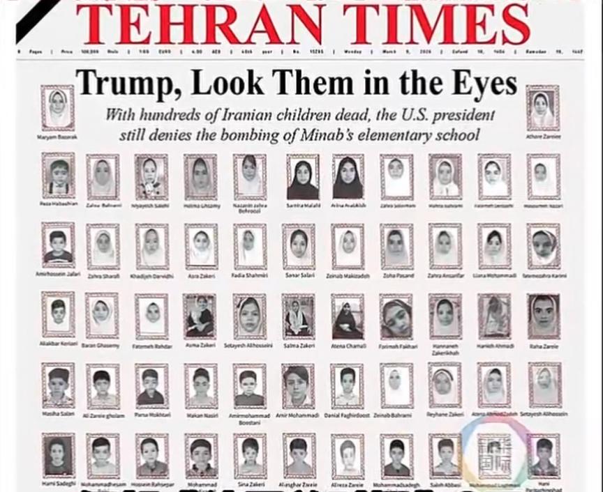 伊朗《德黑蘭時(shí)報(bào)》3月9日在頭版刊發(fā)題為《特朗普,請(qǐng)注視他們的眼睛》的文章,此前美國空襲導(dǎo)致伊朗南部米納卜市一所小學(xué)至少165人遇難、96人受傷 圖片來源:新華社