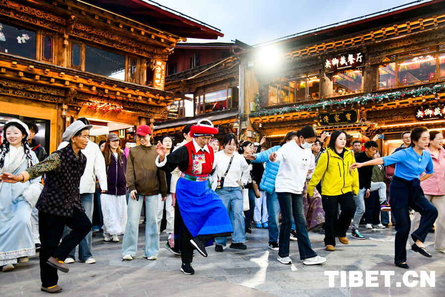 2025年8月16日,在云南省迪慶藏族自治州香格里拉市建塘鎮(zhèn)獨克宗古城龜山公園腳下古城內(nèi),各民族同胞一起跳起鍋莊舞。攝影:趙振宇