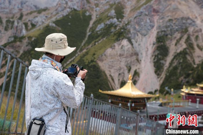 8月20日,參加2024瀾湄國際影像周的中外嘉賓來到青海省玉樹藏族自治州囊謙縣的達那寺,攝影師拍照留念。達那寺是囊謙縣唯一一座國家級文物保護單位。達那寺藏語稱為“達那僧格南宗”,意為“馬耳獅子天堡”,因其坐落之山形似獅子、山上一塊巖石酷似馬耳而得名。中新社記者 薛蒂 攝