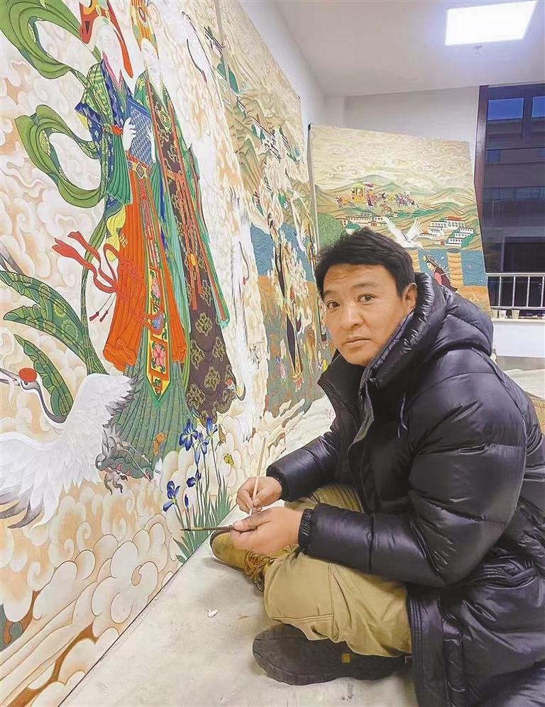 2012年到2019年,在西藏推進(jìn)“西藏百幅新唐卡工程”中,這種扎根生活的創(chuàng)作理念得到充分展現(xiàn)。他與200多位畫師共同創(chuàng)作的《青藏公路通車》《西藏和平解放》等作品,將重大歷史事件與藏族民間敘事巧妙結(jié)合,既展現(xiàn)了時(shí)代變遷,又保留了民族藝術(shù)特色。這種“唯美唯新唯唐”的創(chuàng)作追求,為西藏主題性繪畫開辟了新路徑。