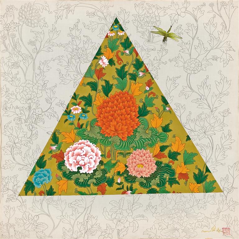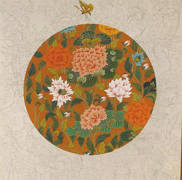 “我喜歡把傳統(tǒng)的壁畫、唐卡里的花卉等元素表現(xiàn)在作品中,其次將這些元素進(jìn)行當(dāng)代轉(zhuǎn)譯,通過布面重彩的形式重構(gòu)敘事,最后注入對(duì)西藏現(xiàn)代化進(jìn)程的深度觀照?!崩痛稳收f,“這種創(chuàng)新不是簡(jiǎn)單的符號(hào)拼貼,而是要在吃透?jìng)鹘y(tǒng)技藝精髓的基礎(chǔ)上,像青稞扎根土壤般從西藏本土文化中生長(zhǎng)出當(dāng)代藝術(shù)語言?!?/p>