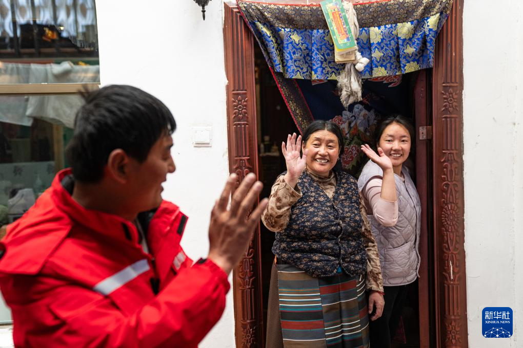 4月26日,西藏錦杭新能源有限責(zé)任公司工作人員入戶檢查完供暖情況后和居民道別。新華社記者 丁增尼達(dá) 攝