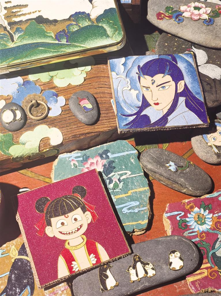 只見占地不到20平方米的小屋內,擺放著各類唐卡畫作。既有傳統(tǒng)唐卡作品,亦有動畫人物的“繪像”。描邊的金屬絲和光滑的質感表面讓人忍不住駐足欣賞。店里陳列著巴掌大小的掐絲唐卡,金線掐絲在礦物顏料映襯下流光溢彩。畫師兼老板的南吉合多杰正在完成一份岡仁波齊的客單:“勉薩畫派的特色是線條細膩,顏色過渡自然。選好圖案后,會根據載體材質、大小(例如石頭大小、木板長短等)收費?!彼贿呎f著,一邊用特制工具將顏料注入金絲隔斷。