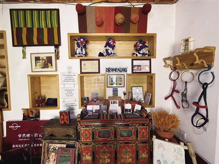 進入卓番林,只見狹長的店面內琳瑯滿目地擺著各類富有藏元素的物件,里側的木質貨架上整齊掛著多條不同顏色和格紋樣式的織物,貨架上方擺放著展示手工編織過程的照片。工作人員告訴記者,這些都是可售賣的,除此之外,游客來到這里,還可以體驗酥油香皂、酥油唇膏、藏式刺繡等手工DIY。