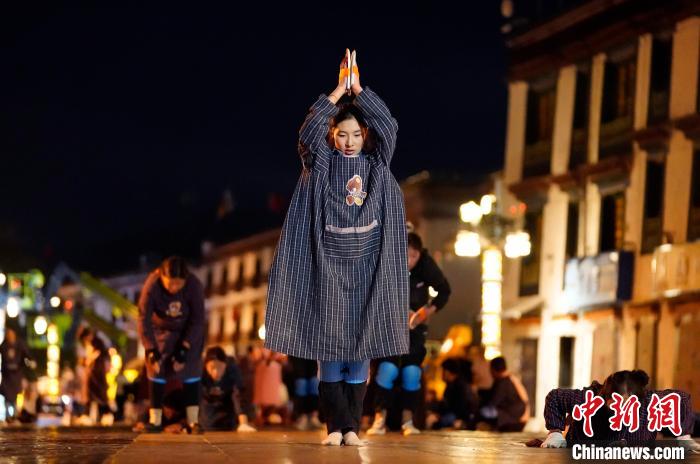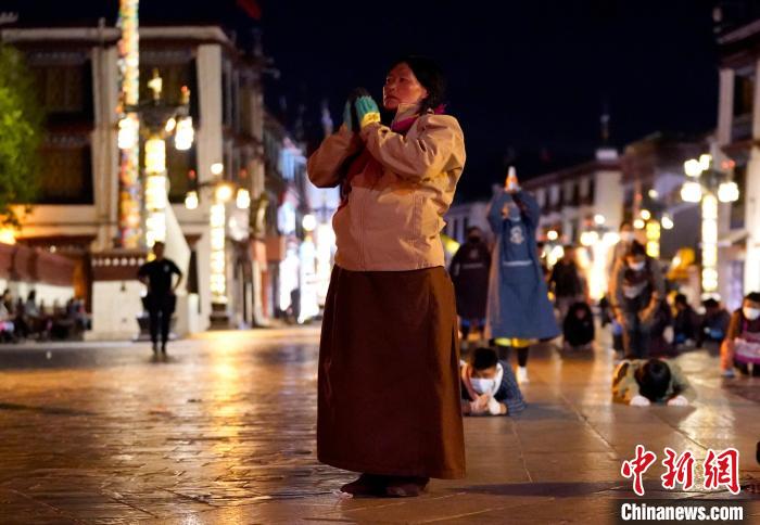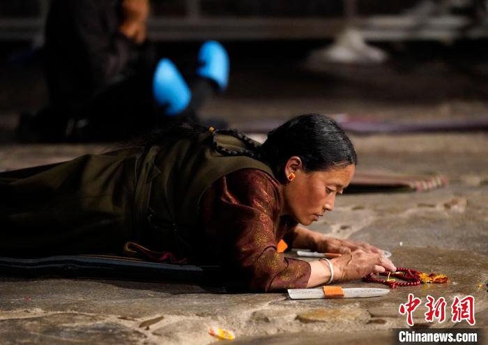 圖為當(dāng)日凌晨,信眾在拉薩大昭寺前磕長頭。中新社記者 李林 攝