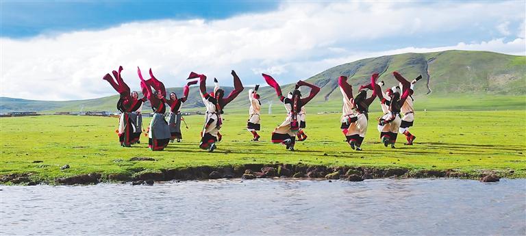近年來,那曲文旅局以那曲傳統(tǒng)鍋莊舞展演為突破口,進(jìn)一步推進(jìn)那曲優(yōu)秀傳統(tǒng)文化創(chuàng)造性轉(zhuǎn)化和創(chuàng)新性發(fā)展,全力打響那曲鍋莊舞品牌。 圖為那曲市群眾藝術(shù)鍋莊隊(duì)隊(duì)員在草原上跳鍋莊舞。(那曲市文旅局非遺處提供)