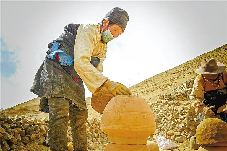 彭崗陶器制作工序繁復(fù),需歷經(jīng)取土、運輸、粉碎、塑型、曬干、上水、燒制、成型、上漆(釉)等9道流程。僅取土環(huán)節(jié)便大有門道。年幼的桑珠緊隨舅舅,攀上海拔4475米的扎拉山山頂,在那處獨特土源地采擷優(yōu)質(zhì)黏土。
