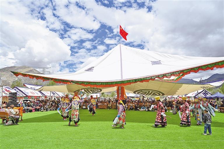 圖為7月16日,民間藏戲表演隊在南木林縣非遺公園內(nèi)表演湘巴藏戲。新華社記者 李鑫 攝
