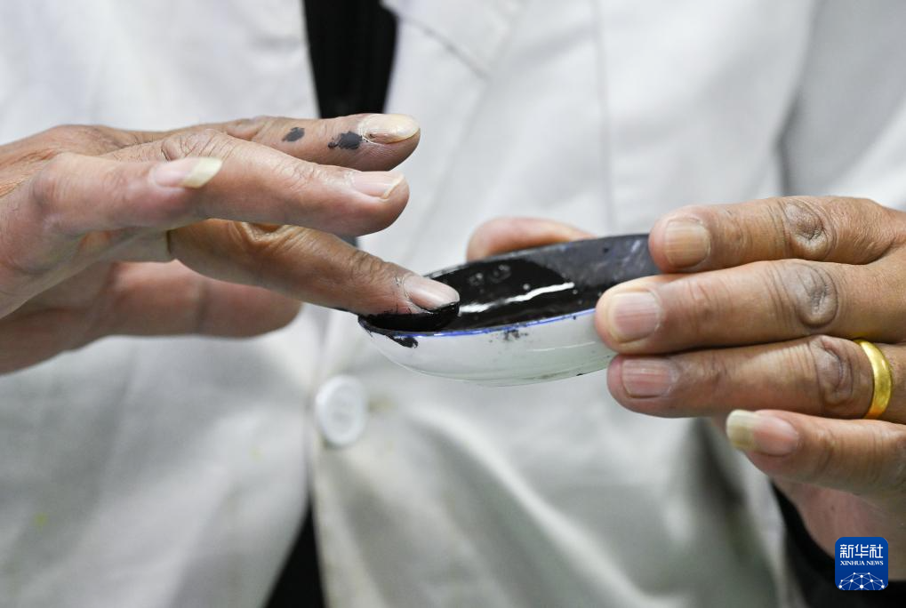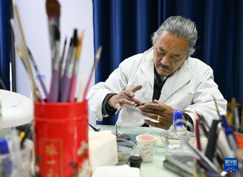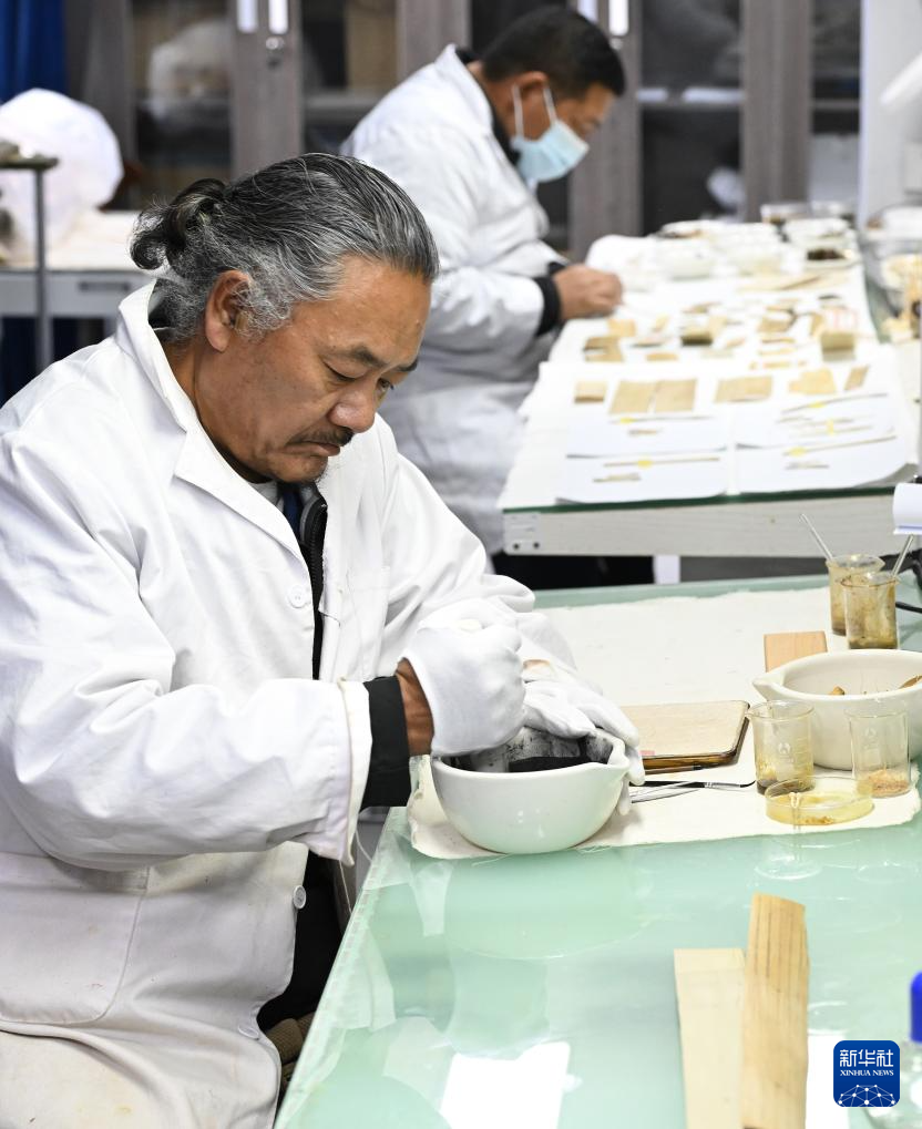 布達(dá)拉宮貝葉經(jīng)實(shí)驗(yàn)性修復(fù)小組實(shí)驗(yàn)室工作人員對(duì)用于貝葉修復(fù)的顏料進(jìn)行研磨處理(5月25日攝)。新華社記者 旦增尼瑪曲珠 攝