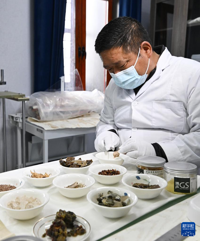 布達(dá)拉宮貝葉經(jīng)實(shí)驗(yàn)性修復(fù)小組實(shí)驗(yàn)室工作人員對(duì)用于貝葉修復(fù)的粘合劑原料進(jìn)行加工(5月25日攝)。新華社記者 李賀 攝