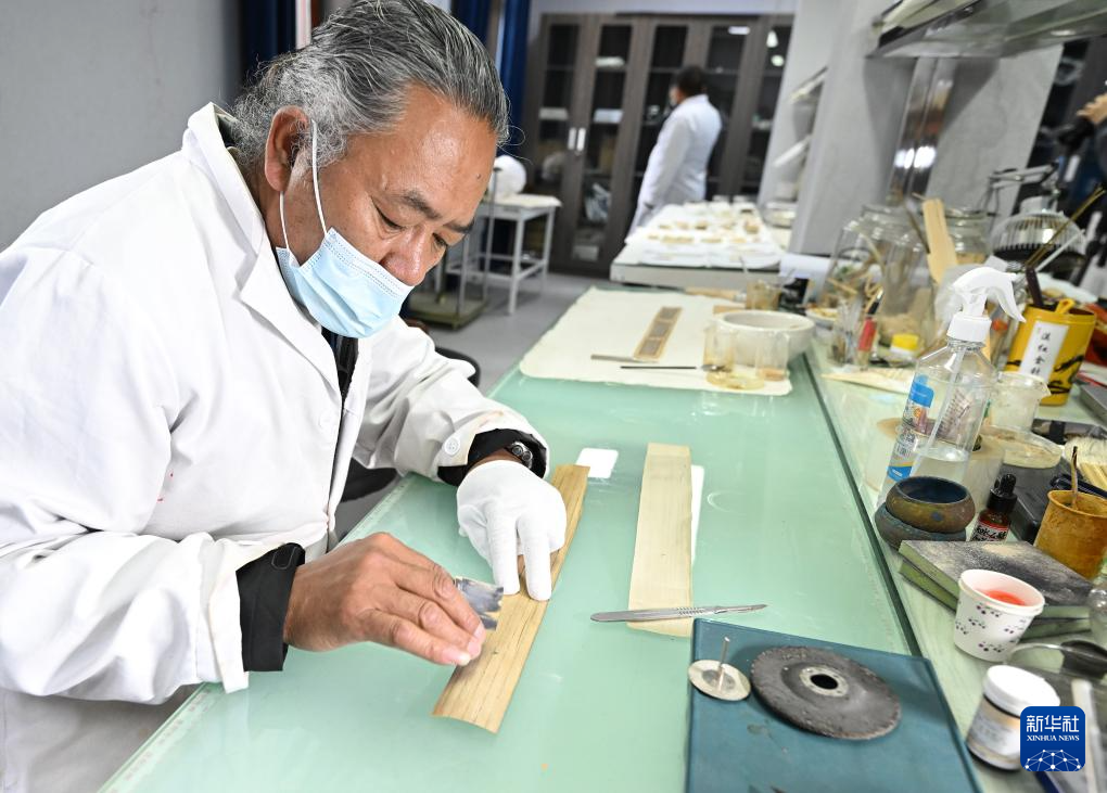布達(dá)拉宮貝葉經(jīng)實(shí)驗(yàn)性修復(fù)小組實(shí)驗(yàn)室工作人員對(duì)貝葉進(jìn)行處理(5月25日攝)。新華社記者 李賀 攝
