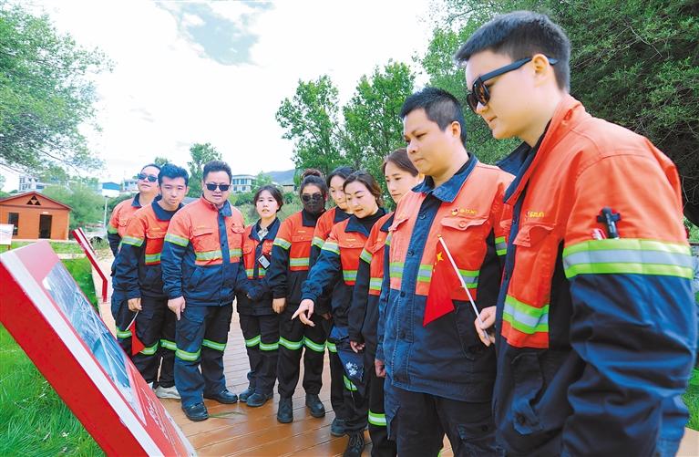 企業(yè)員工在赤康村黨史館參觀學(xué)習(xí)宣傳展板。記者 格桑倫珠 攝