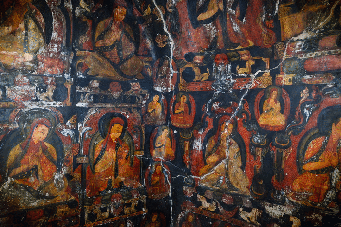 “你們看,這些壁畫顏色多鮮亮,千年不褪色!因為用的全是礦石做的顏料?!睋?jù)仁增旺扎介紹,皮央石窟分布于前山與后山,石窟數(shù)量接近千座,其中5座內(nèi)繪有壁畫。有研究表明,這里出土的鎧甲片、戰(zhàn)刀等文物,與古格遺址中的同類器物高度相似,皮央石窟在千年前或曾是古格王國的一處重要方城。