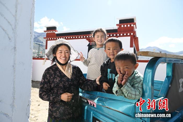 2025年8月15日,西藏日喀則市定日縣森嘎村舉行“定日6.8級地震災(zāi)后恢復(fù)重建民房首批入住儀式”。圖為森嘎村一戶村民一家在新房門口。中新社記者 貢嘎來松 攝