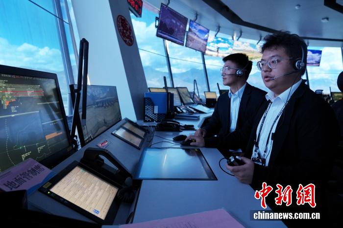 2025年7月22日,塔臺管制室?guī)О嘀魅蔚┰?左,藏族)與見習(xí)管制員管羽揚(右)在拉薩貢嘎國際機場塔臺指揮航班進離場。據(jù)悉2025年是西藏自治區(qū)成立60周年,也是西藏民航通航60周年。中新社記者 張祥毅 攝
