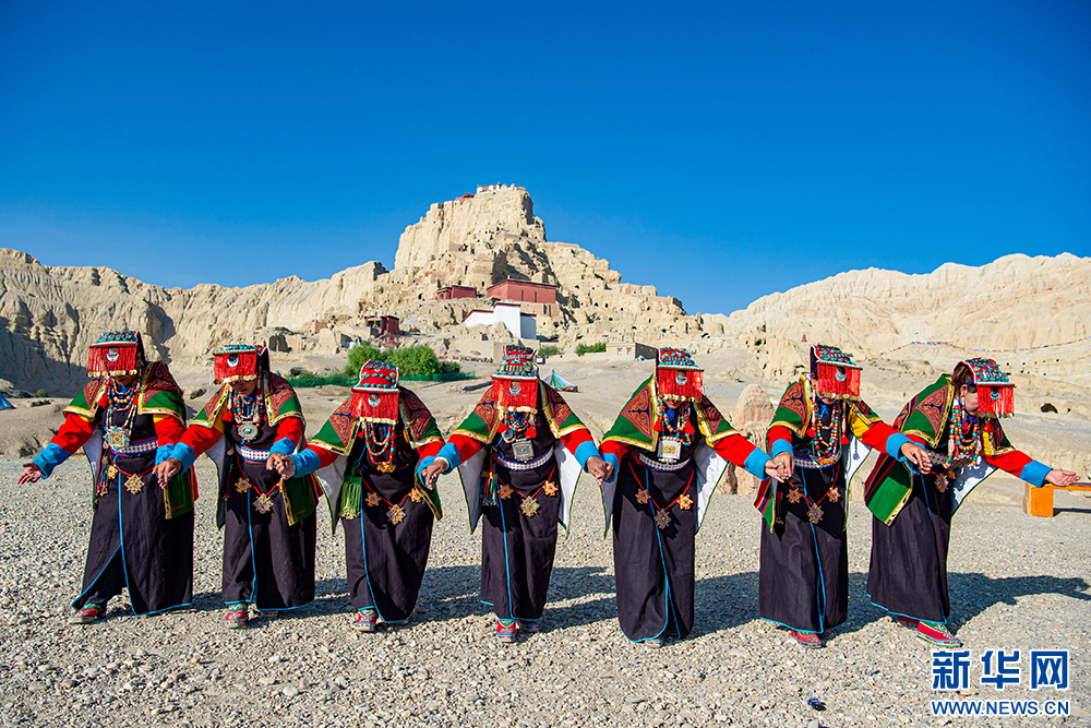 札達縣群眾在古格王國遺址腳下表演“宣舞”(6月12日攝)?!靶琛笔俏鞑匕⒗锩耖g傳統(tǒng)舞蹈,融合藏戲、舞蹈、說唱等傳統(tǒng)民間藝術(shù),內(nèi)容涵蓋禮儀、風(fēng)俗、節(jié)慶等。2008年,被列入國家級非物質(zhì)文化遺產(chǎn)名錄。新華網(wǎng) 旦增努布 攝
