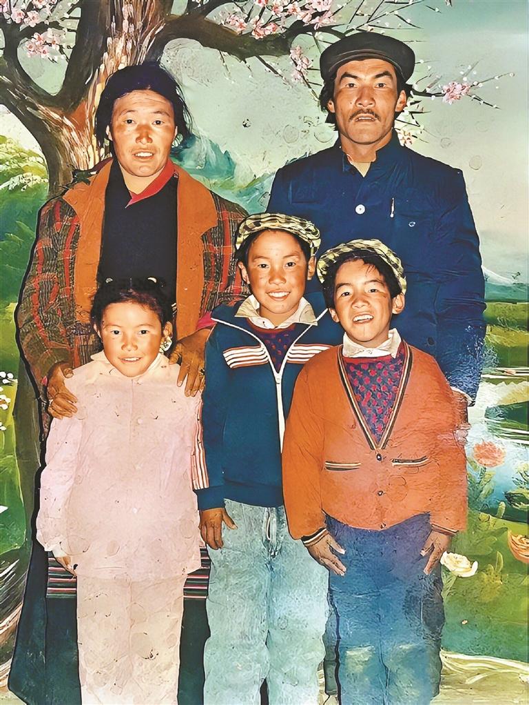 相冊的第二頁,夾著一張略顯褪色的彩色照片。這是1996年的藏歷新年,全家人第一次走出大山,到日喀則置辦年貨時拍的。照相館的師傅讓他們挨著布景站好,“咔嚓”一聲,留下了這個家庭的第一張全家福。