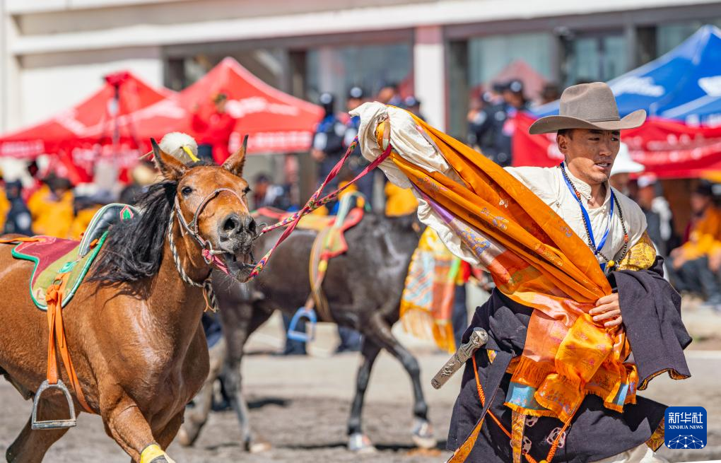 9月7日,騎手在傳統(tǒng)大跑項(xiàng)目前等待開賽。新華社記者 丁增尼達(dá) 攝