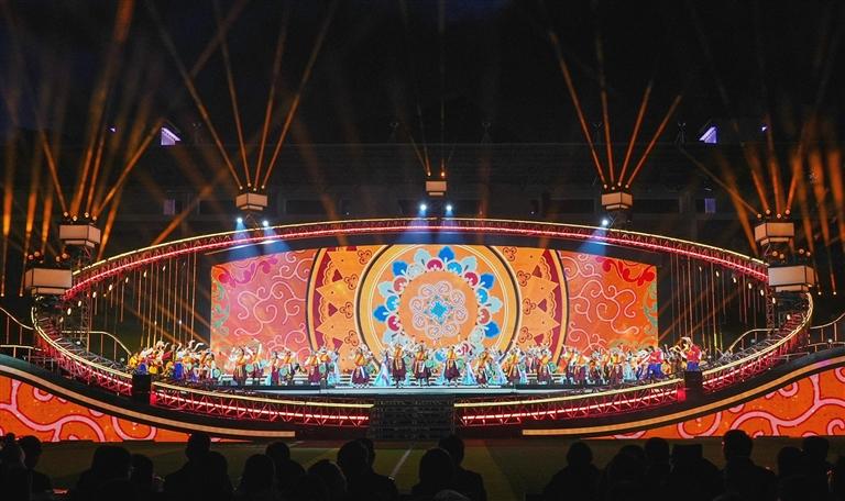 舞臺(tái)設(shè)計(jì)同樣暗藏巧思,主體采用巨型“同心圓”架構(gòu),設(shè)計(jì)中巧妙嵌入藏族傳統(tǒng)建筑的經(jīng)典紋樣,同時(shí)將山南的人文風(fēng)貌與山水景致融入其中,讓地域特色與藝術(shù)美學(xué)自然交融。