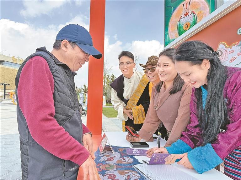 “萬人墨竹探親游”活動的探親證發(fā)放處人潮擁擠,排隊申請領(lǐng)證的市民絡(luò)繹不絕?!拔覀儨?zhǔn)備了1萬本免費發(fā)放的探親證,探親證上詳細(xì)介紹了紅色文化游、藍(lán)色康養(yǎng)游、綠色生態(tài)游、文化探秘游、墨竹深度游精品線路的詳細(xì)內(nèi)容供大家選擇。屆時,我們將準(zhǔn)備好香甜的青稞酒、潔白的哈達(dá)、美味的藏餐等候咱們南京的兄弟姐妹回雪域高原的墨竹家中看看、坐坐?!蹦窆たh文化旅游公司負(fù)責(zé)人扎西措姆在探親證發(fā)放現(xiàn)場介紹道。