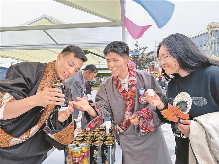 文化展演區(qū)內(nèi),伴隨著歡快的民族音樂響起,墨竹工卡縣松贊藝術(shù)團演職人員與南京市民一起跳起了歡快的鍋莊。歌舞表演的互動環(huán)節(jié),觀眾上臺制作糌粑,品嘗酥油茶,一系列豐富有趣的互動環(huán)節(jié),不斷加深著各民族之間的交往交流交融,也展現(xiàn)了墨竹工卡縣各族群眾熱愛家鄉(xiāng)、團結(jié)友善、不斷進取的良好精神風(fēng)貌。