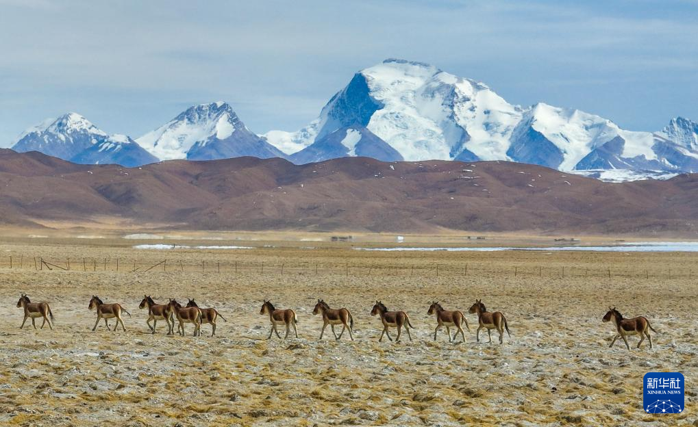 3月29日,藏野驢在西藏阿里地區(qū)普蘭縣境內(nèi)岡仁波齊峰下覓食。