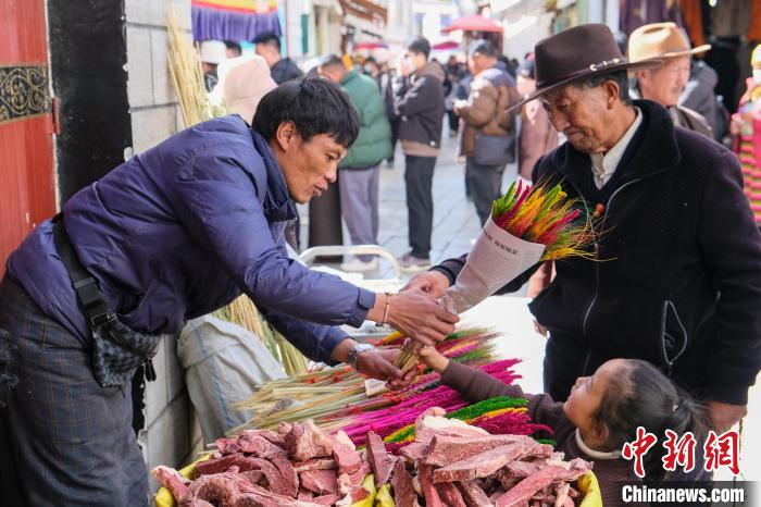 2月5日,拉薩藏歷新年年貨市場(chǎng),桑旦賣出一把羅薩美朵。中新社記者 江飛波 攝